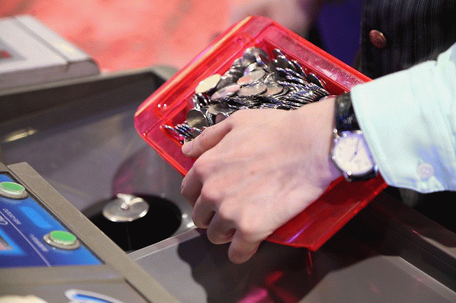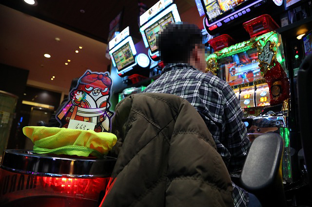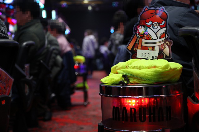 パチンコエリアでは、おなじみの通路にぎっしりと積まれた玉箱の山が増殖中。
