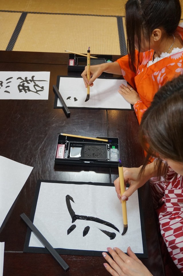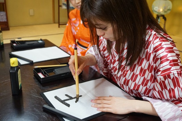 書道が特技という大澤玲美ちゃんをお手本にしながら、ゆずっき〜が筆で文字を書きまくります。