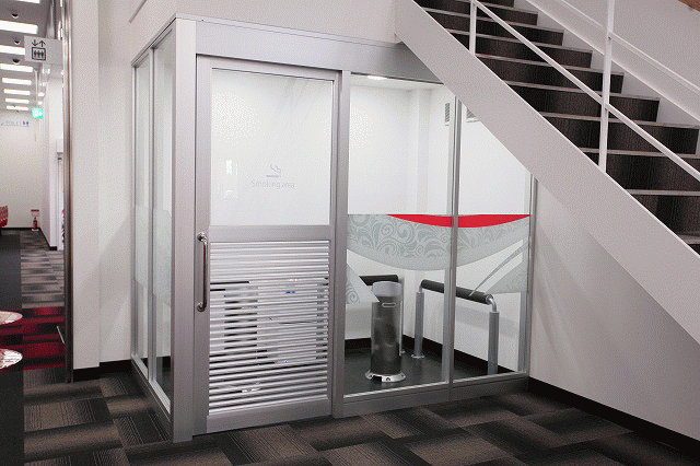 遊技中は吸わないけれど、ホッと一息つきたい時間を所望するファンのため、ホール内には喫煙室も設けられているぞ。