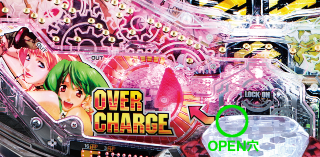 ヘソ入賞時に物理的な振り分けで「OPEN」穴に玉が入ると、その隣にある「オーバーチャージ」入賞口が開きます。ここに玉が入ると特図2(電チュー)での抽選が行われるのです。