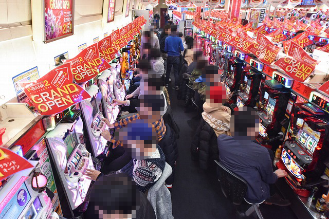 開店早々にお目当ての台を確保しようと、多くのファンでごった返すパチスロエリア。