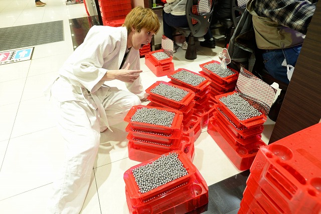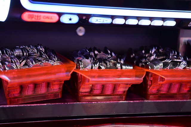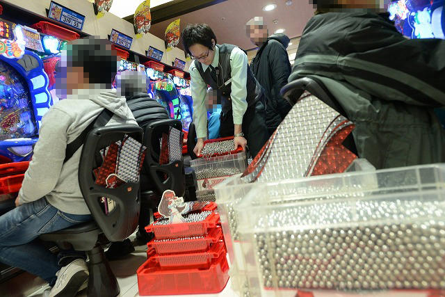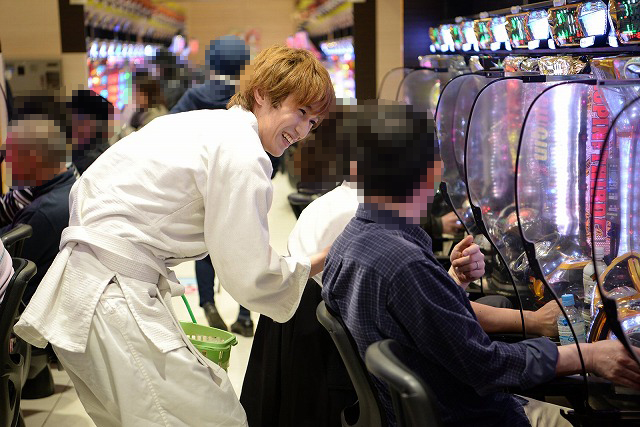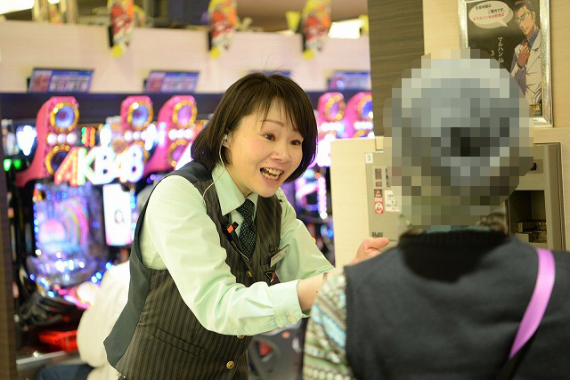 出玉で店内が溢れんばかりの勢いでも、冷静かつスムーズな対応を見せるフタッフ陣。