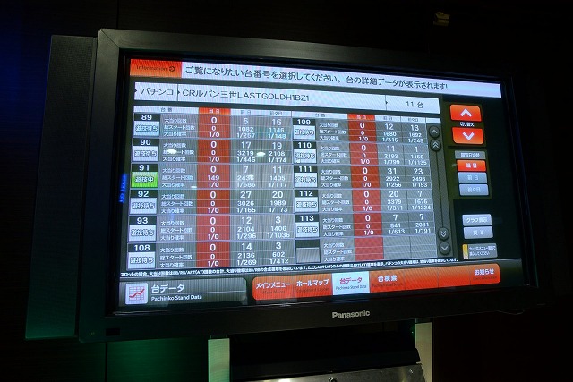 | 各台のデータをチェックできる大型モニターを完備。立ち回りに活用しよう。 | |