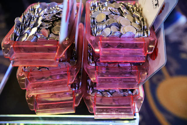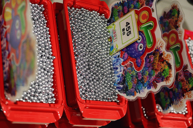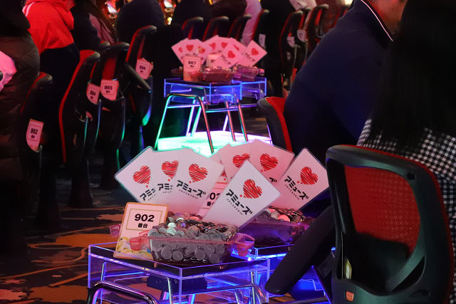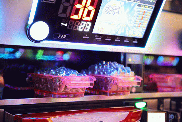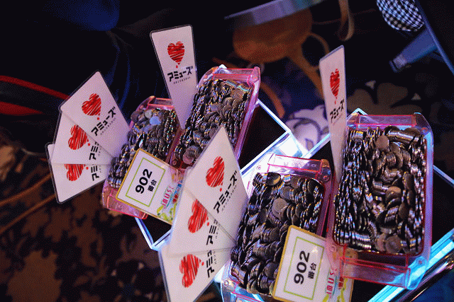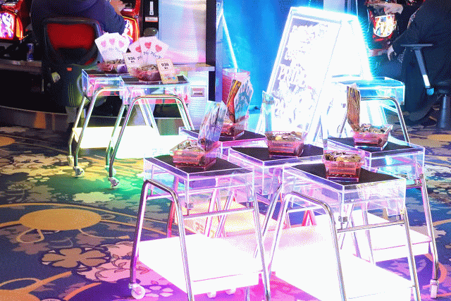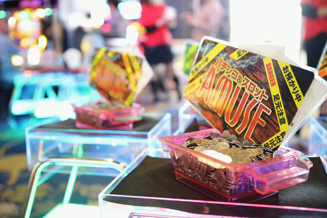 色とりどりの光の装飾を纏ったドル箱の摩天楼が、夜の帳(とばり)を彷彿とするパチスロエリアに映える!