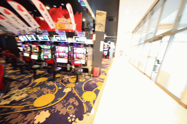 エキゾチックな、幾何学模様の絨毯が敷かれたパチスロエリア