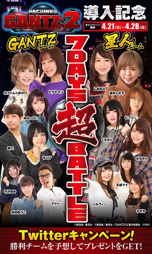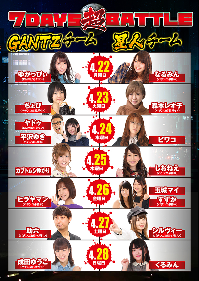そんな『ぱちんこ GANTZ:2』の魅力と実力を伝えるため、超豪華メンバーが2チームに分かれて超真剣に対決する「7DAYS超バトル」が、明日から始まるんです!