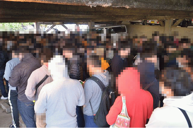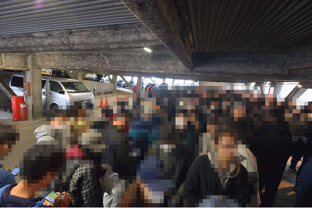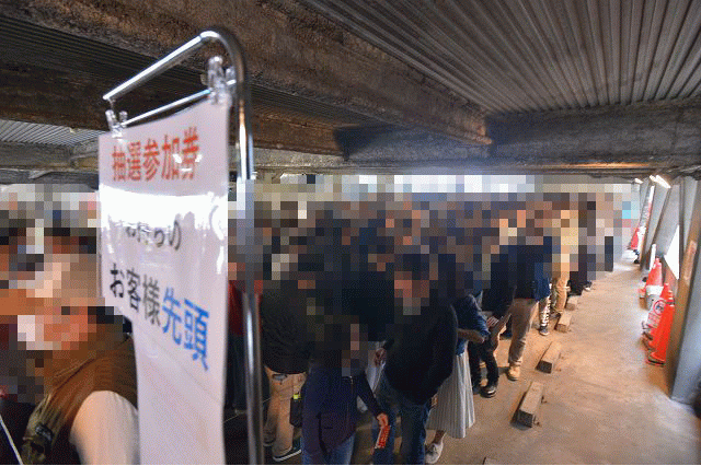 屋内駐車場にビッシリと並ぶファン。オープン直後に満席確定だ!