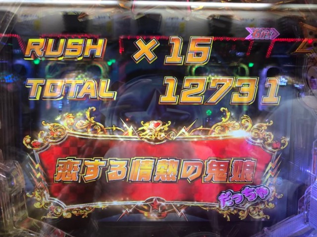 実戦終盤、ヤドゥが本機最強リーチである「ラブソングリーチ」で見事4R確変大当りを射止める。