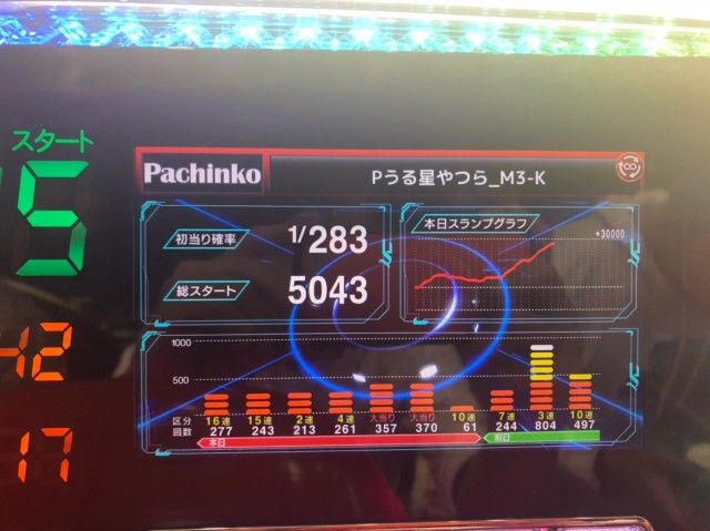 このSTが2連で終了するも、ST抜けの残り電チュー保留1回転で当てるというミラクルもあり、9連約9000個獲得で持ち玉は約17000個を超えます。