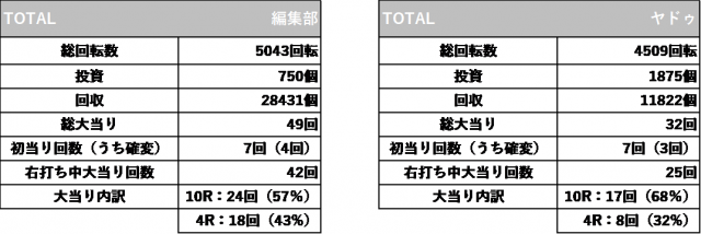 ヤドゥは通常時こそ振り分け負けしていますが、時短引き戻しも複数回あり、右打ち中は10R大当りが7割弱と満足のいく結果に。