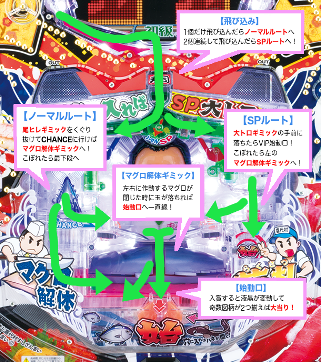 飛び込みから始動口までの、玉の流れは以下のとおり。