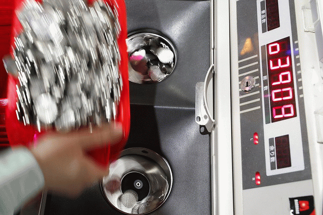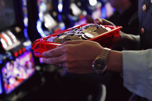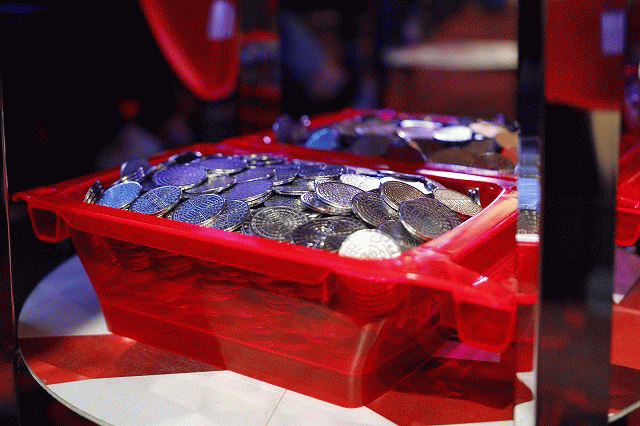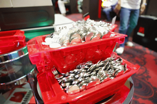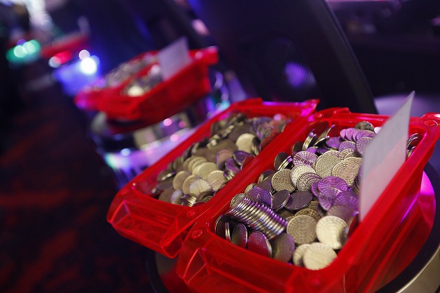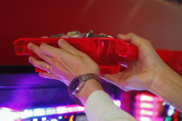上部のドル箱置き場に置ききれないドル箱が、続々と別積みされていく!