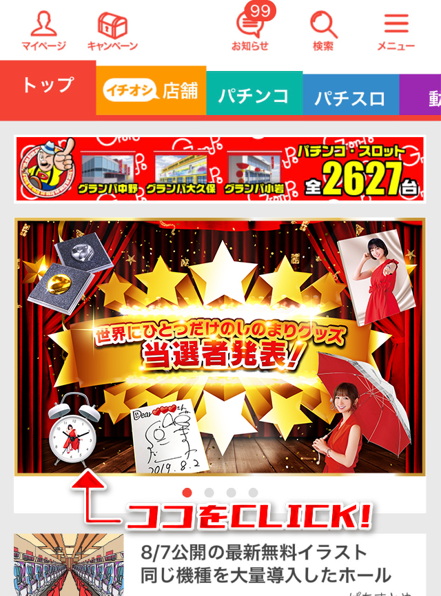 Wチャンスの抽選結果は、DMMぱちタウンアプリの「世界にひとつだけのしのまりグッズ当選者発表!」と書かれたバナー