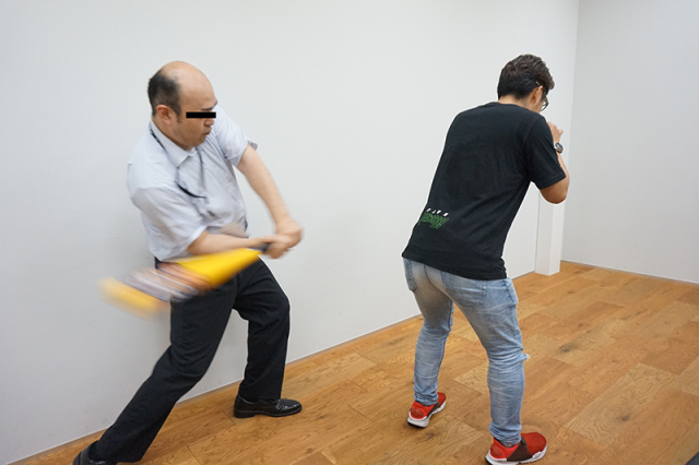 その様子をじっと見守っていた仕置人。ゆっくり立ち上がると、上着を脱いだヤドゥの背後でバットを振りかぶります。