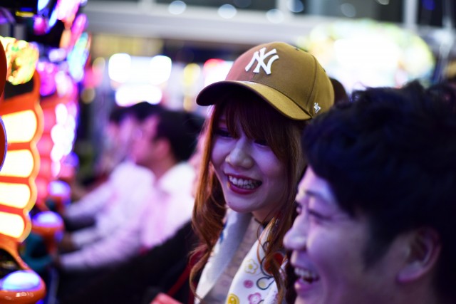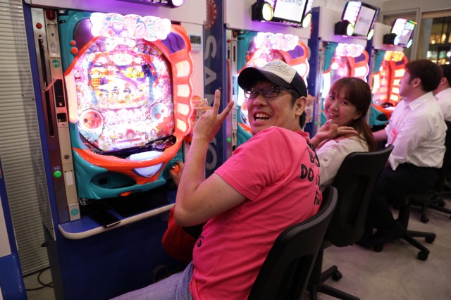 まず実施されたのは、『PAスーパー海物語 IN JAPAN2 with 太鼓の達人』実機バトル大会。「タレントVSイベント参加者」のチームバトルです。