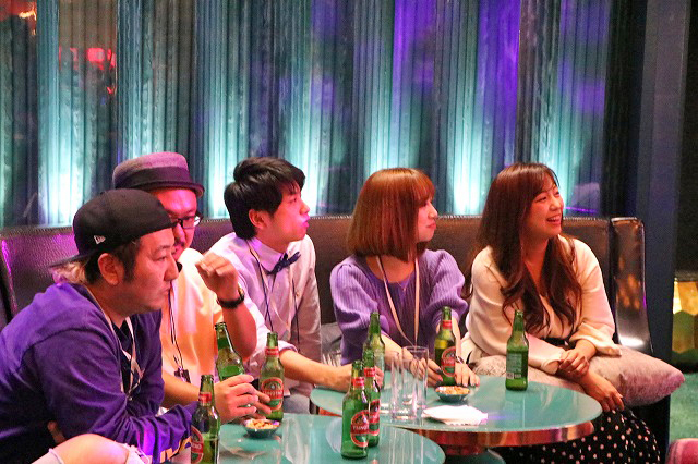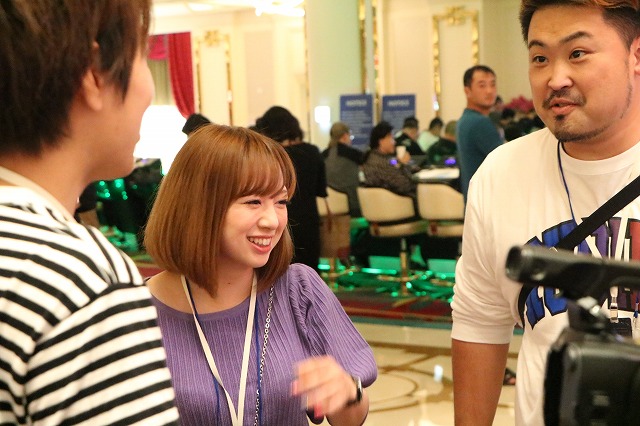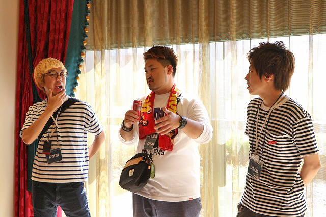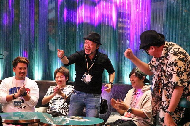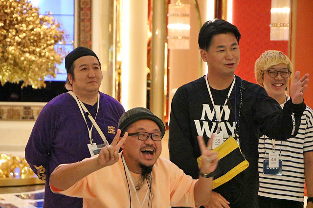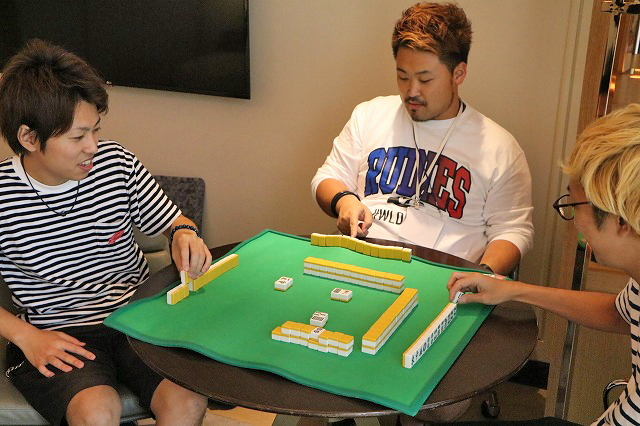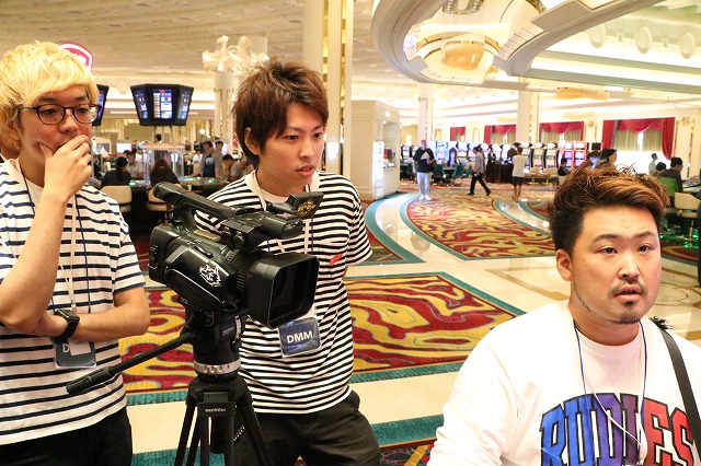 ホテルの部屋に戻ってサンマを始めるDMMぱちタウンチーム。