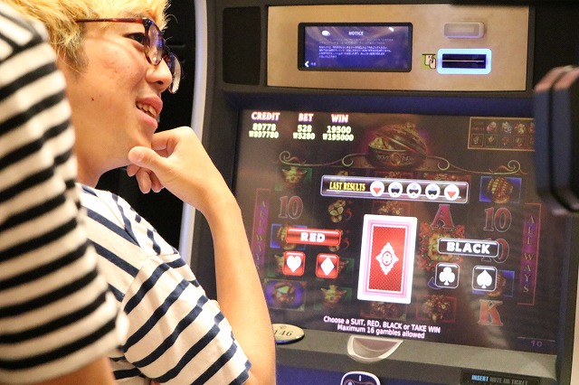 各自100万ウォンをプレイ用のチケットに変えて実戦開始。チケットはホールで使うICカードみたいなもので、出し入れ自由。台移動もできます。ホールでサンドに紙幣を投入する要領で、筐体に直接現金を入れることもできますよ。