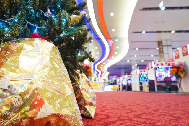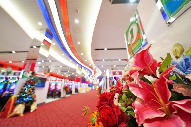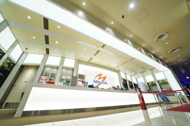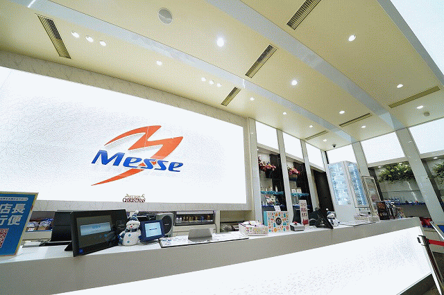 中央にメッセロゴが構える特大賞品カウンターをはじめ、付帯設備も充実! フロアのどこにいてもくつろげるよう、休憩室やスペースが設けられている。