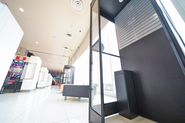 | 壁側通路には、休憩用のベンチだけでなく、贅沢なお一人様用喫煙ボックスも完備する! |