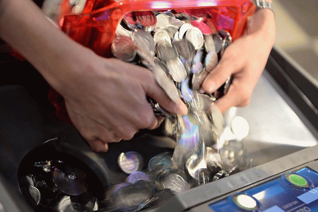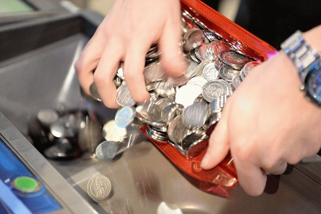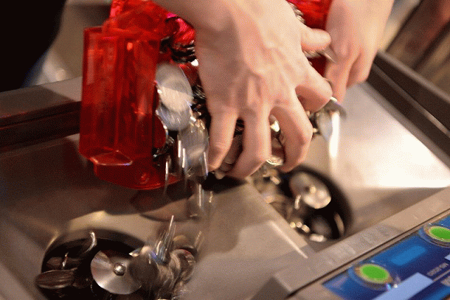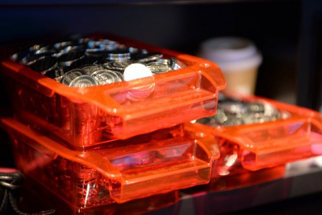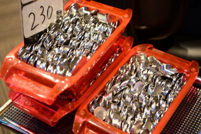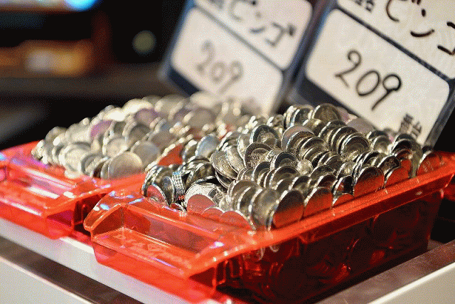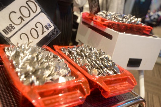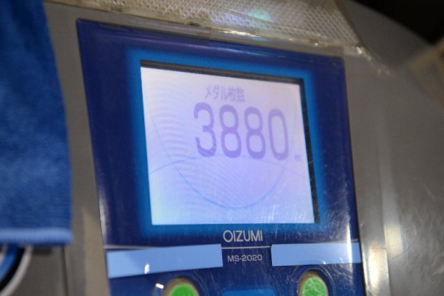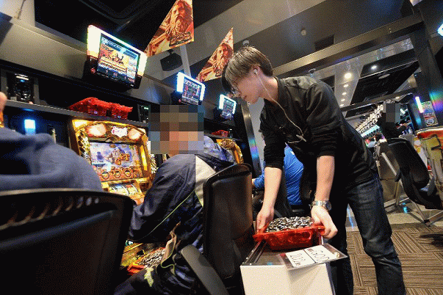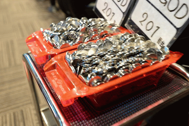 これだけのドル箱を捌くのは一苦労と思われるが、百戦錬磨の敏腕スタッフが別積み・メダル流しをテキパキとこなしていく。