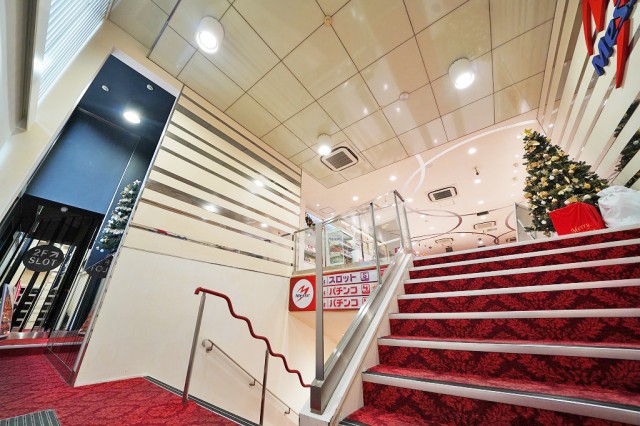 正面から臨むBF&1Fのパチンコフロアと、上階2Fのパチスロフロアとなっている。