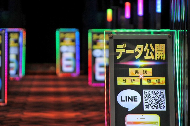 もはや各台計数機、肘置き、パーテーションボードが付いているのは当たり前。気になる稼動データまで、いち早くキャッチできるシステムも構築。「LINE」のお友達になれば、誰でもチェック可能だ!
