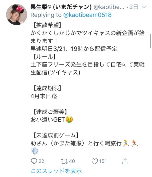3/21から4月末までの期間、ほぼ毎日、自宅でツイキャスを使った実戦生配信を行い、土下座フリーズを目指してもらいます。