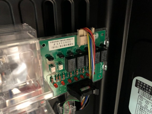 まずはパチスロ筐体内にデータ出力用のハーネスを1本差し込みます。