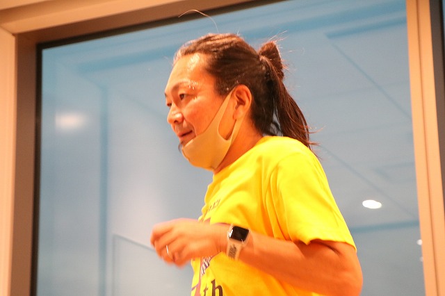 ルームランナーでフルマラソンにチャレンジする大崎一万発さん。本番前の打合せにこの真剣な表情。