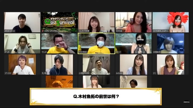 中盤では、ぱちタウンタレントがZOOMで参加して行う「クイズサバイバル」がスタート。ウシオさんが(胸を)ガン見しているのは、ゲストで登場してくれた占い師の叶ここ先生。