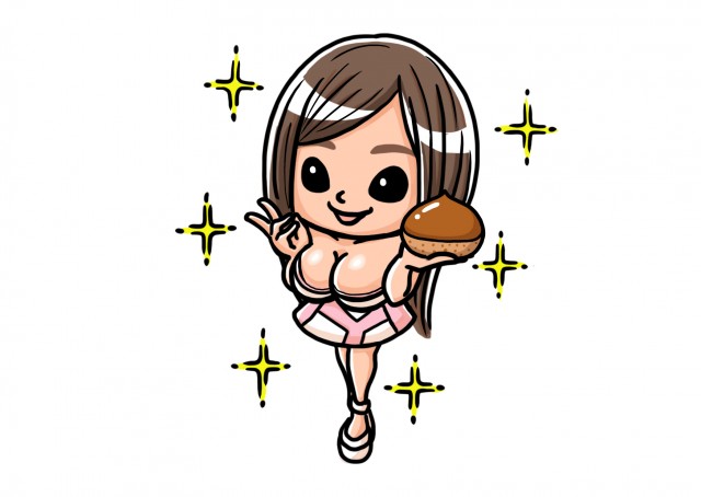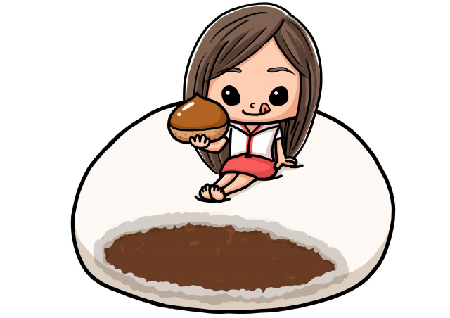 まんじゅうに座って栗を持つ倖田柚希のイラストです