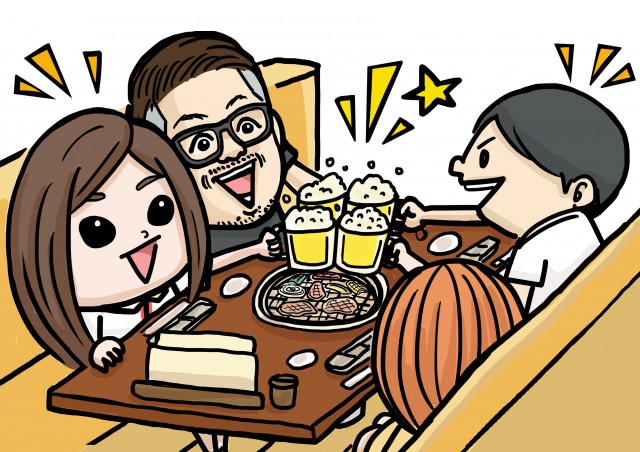 勝って焼肉を食べる倖田柚希ヤドゥと友人のイラストです