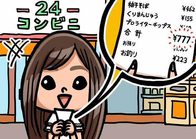 ¥777のレシートを見て喜ぶ倖田柚希のイラストです