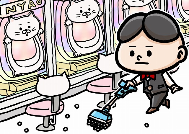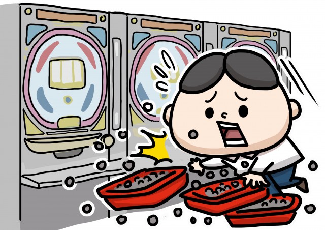 落ちた玉を磁石で集める店員のイラストです