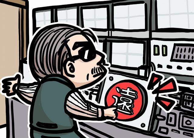怪しいボタンを押す店長のイラストです