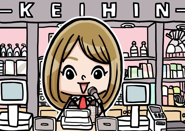 再整列を呼びかけている店員のイラストです