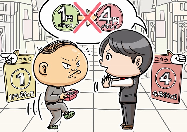 1パチで出した玉を持って4パチに移動している人を止める店員のイラストです