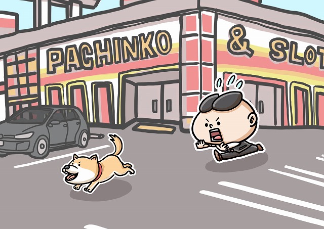パチンコ屋の駐車場を駆け回る犬と追いかける店員のイラストです