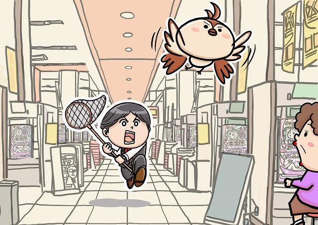 - 店内に入ってきた鳥を追いかける店員