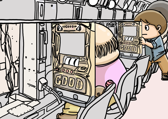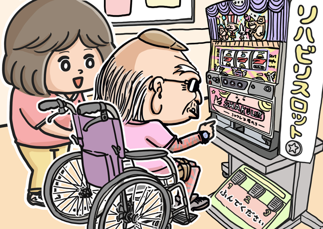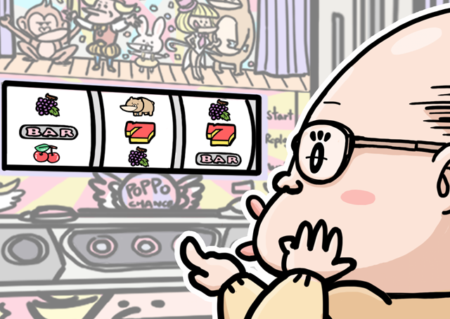 足で踏んで止められる老人ホームのパチスロ台のイラストです
