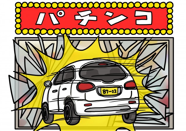 パチンコ屋の入り口に突っ込む軽自動車のイラストです