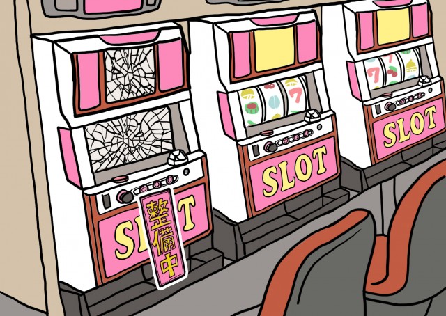 液晶にヒビが入って整備中になったパチスロ台のイラストです