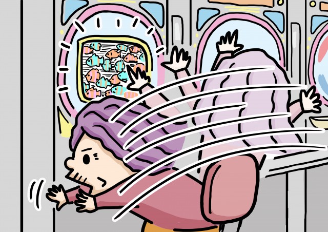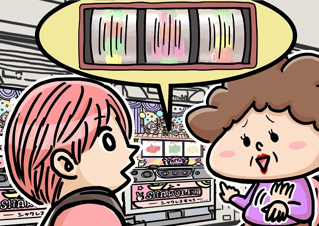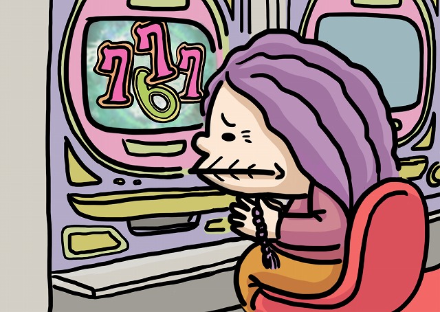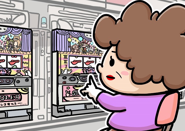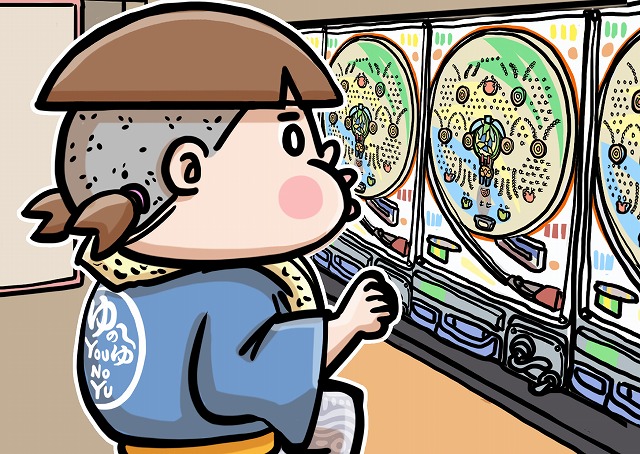 温泉街の遊技場で昔の機種を打つ人のイラストです