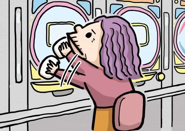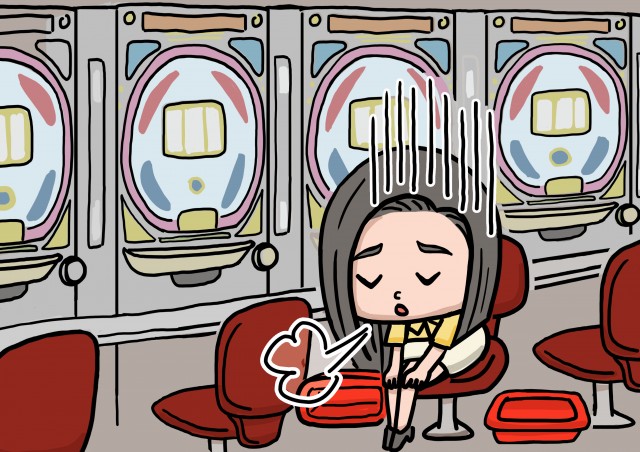 ジャラジャラ派手な音をたててドル箱に玉を落とす人のイラストです
