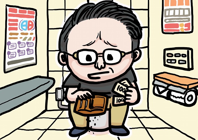 店員がパチンコ台を調整するのを不安そうに眺める人のイラストです