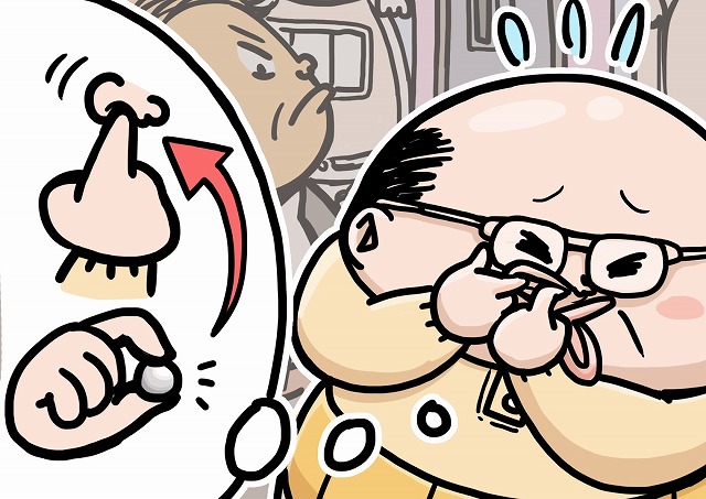鼻の穴に入れたパチンコ玉が取れずに焦る人のイラストです