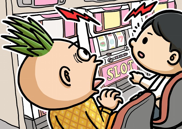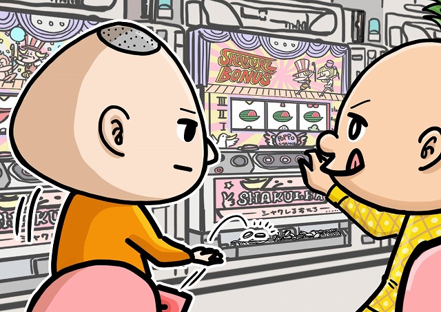 大当たりしたけど持ち玉が無くて焦る人に玉を貸す人のイラストです