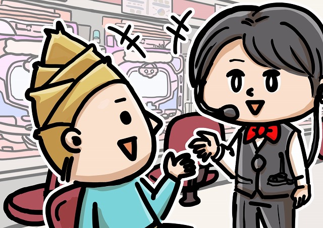 隣の台の音量がMAXで告知音に驚く人のイラストです