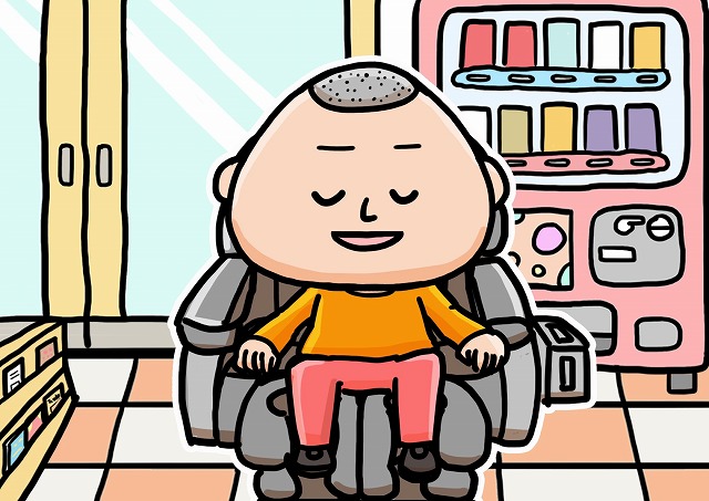 休憩所のマッサージチェアでくつろぐ人のイラストです