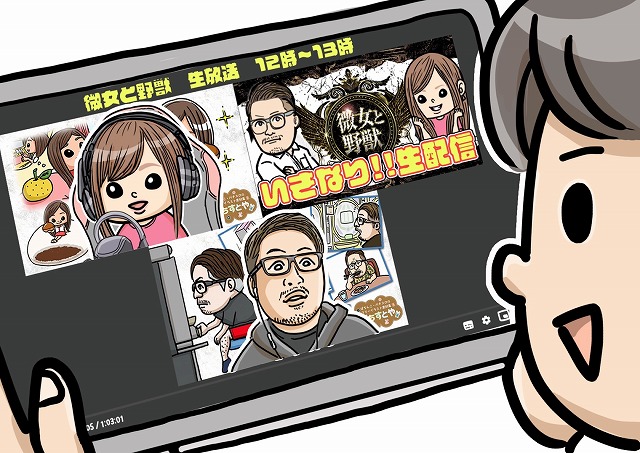 倖田柚希とヤドゥの配信を見る人のイラストです